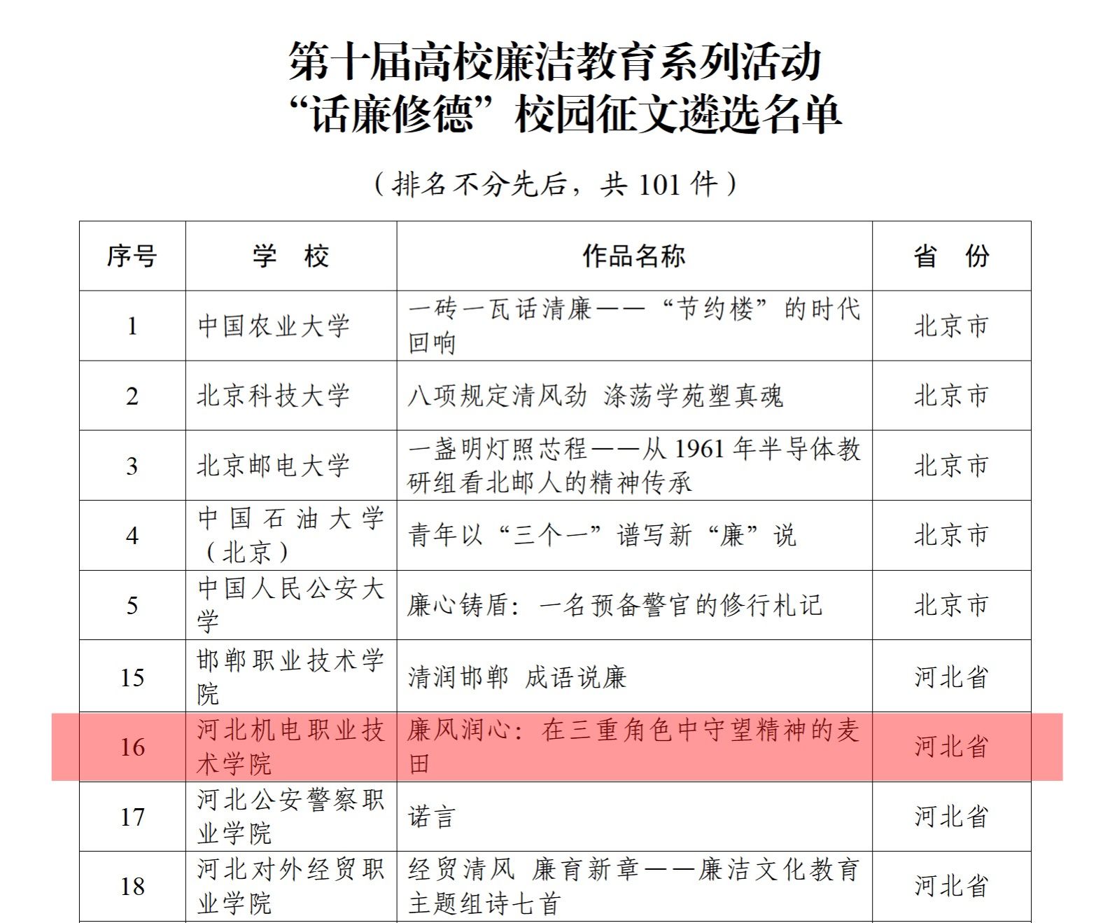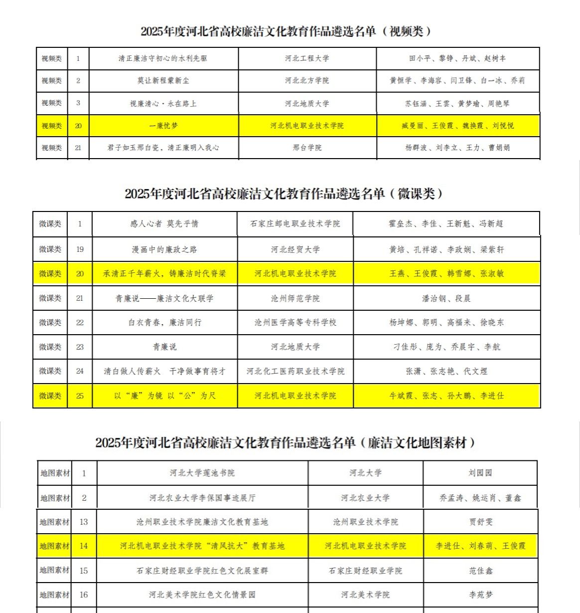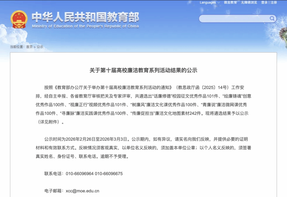 近日,教育部办公厅印发了《关于公布第十届高校廉洁教育系列活动结果的通知》,中共河北省委教育工作委员会印发了《关于2025年度高校廉洁教育文化活动结果的通知》(冀教党建函〔2026〕1号),我校选送作品喜获佳绩。范静老师创作的《廉风润心 在三重角色中守望精神的麦田》入选教育部第十届高校廉洁教育系列活动“话廉修德”校园征文遴选名单。臧曼丽等老师创作的视频类作品《一廉忧梦》、王燕等老师创作的微课类作品《承清正千年薪火,铸廉洁时代脊梁》、牛斌霞等老师创作的微课类作品《以“廉”为镜 以“公”为尺》、李进仕等老师创作的地图素材类作品《河北机电职业技术学院“清风抗大”教育基地》,入选2025年度河北省高校廉洁文化教育作品遴选名单。